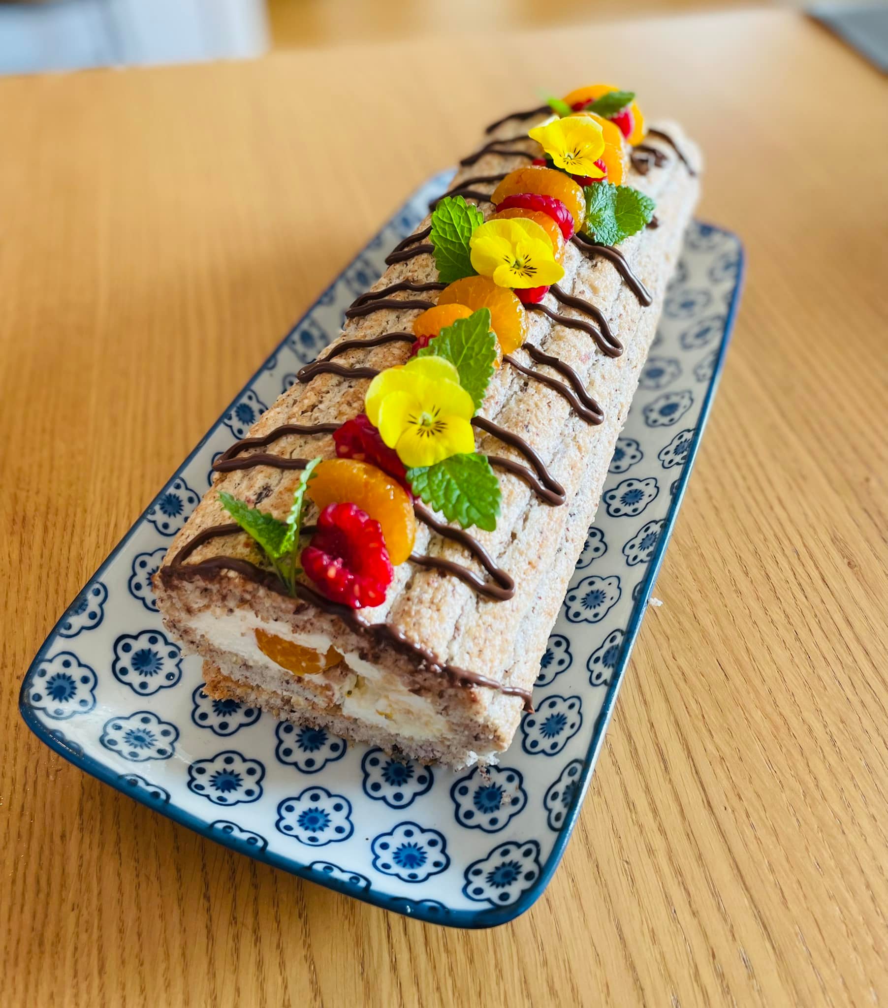 Ta ut botten ur ugnen och låt svalna, lägg på ett bakplåtspapper på botten och vänd den så att du har undersidan uppåt för att få det fina mönstret på rullen utåt. Stryk på ett tunt lager grädde, sprid ut små apelsinbitar och delade hallonbitar och rulla sen ihop till en rulle.