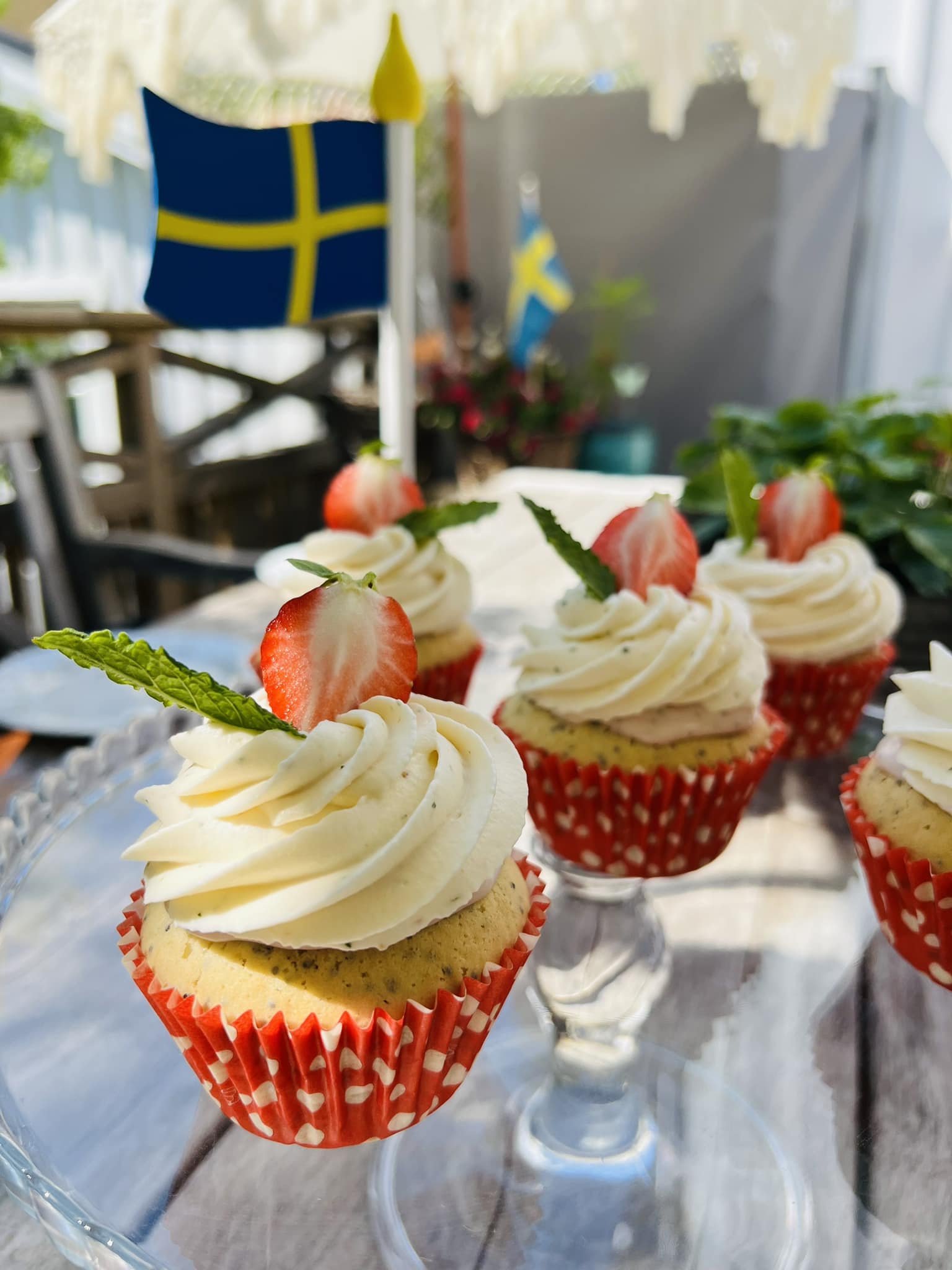 3. Häll över på en spritspåse med tyll, spritsa frostingen på muffinsen och dekorera med jordgubbar och lite mynta eller meliss om du vill.
