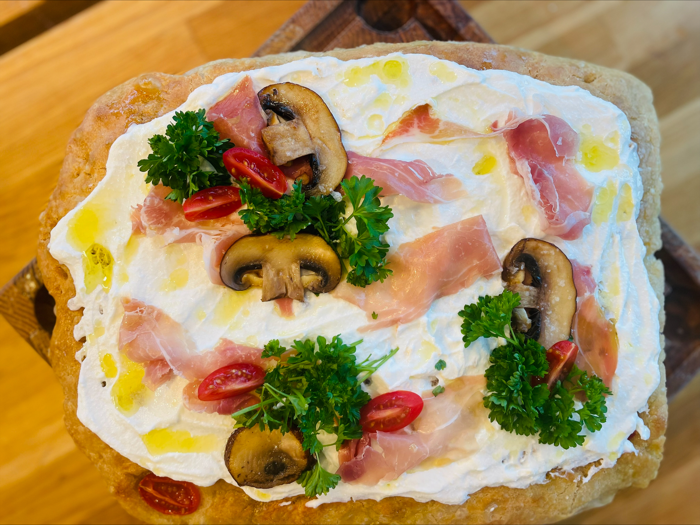 Vispa upp naturell ricotta, fräst svamp, prosciutto, lite salt och persilja. En foccacia kan man toppa med lite vad man vill.