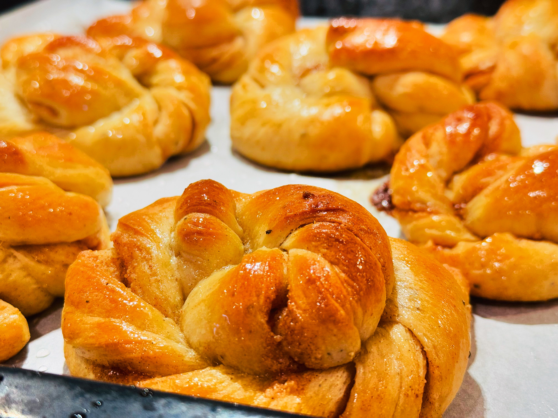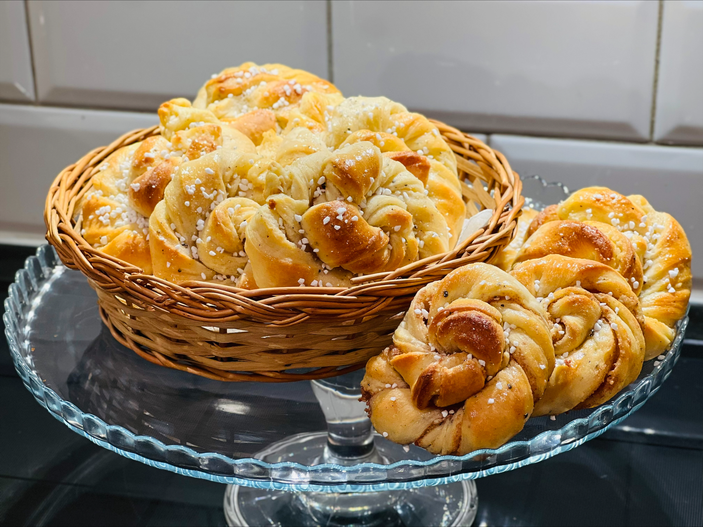 Skär remsor, ca 2 cm breda, tvinna remsorna och snurra sedan ihop till en snurra och lägg på plåt. Jäs i rumstemperatur i ca 30 minuter.