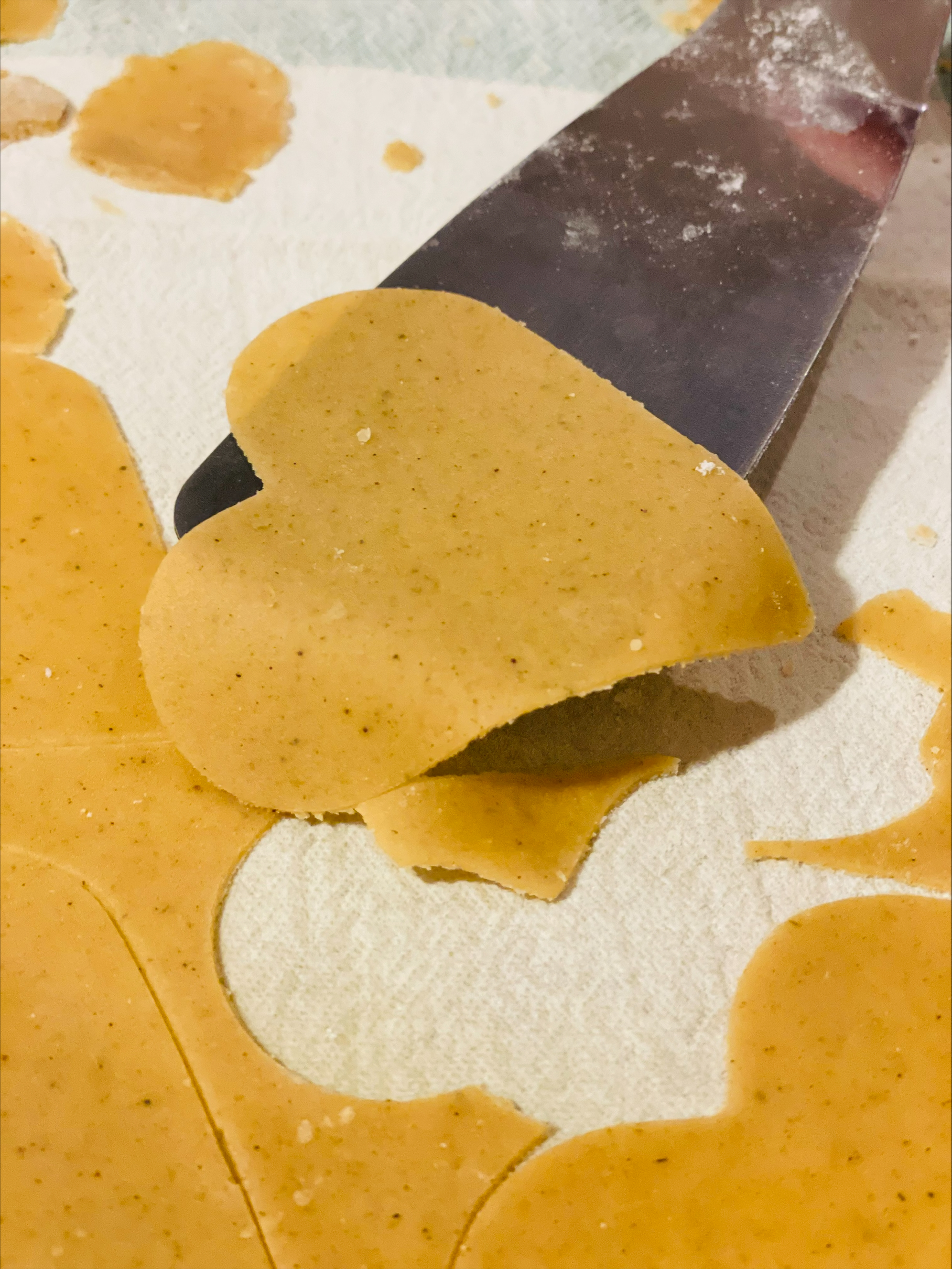 Ta en bit av degen, kavla tunt på mjölad bakbänk. Använd pepparkaksformar för att stansa ut pepparkakor